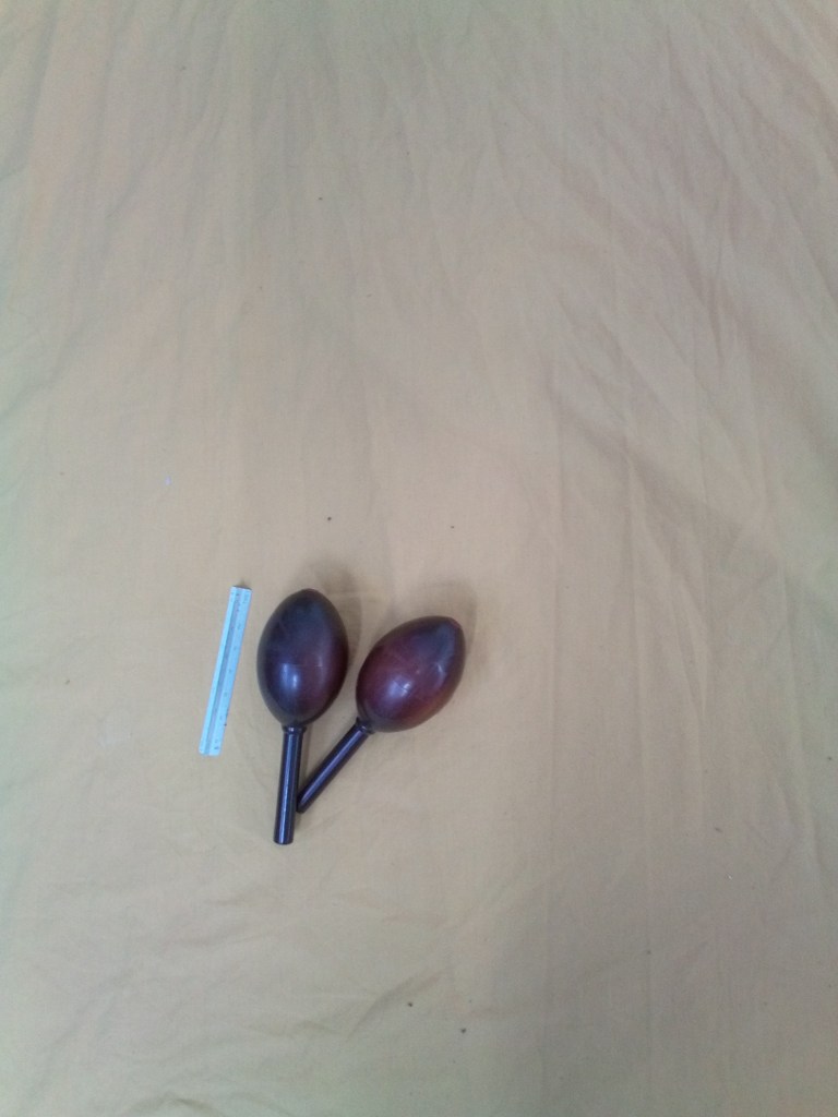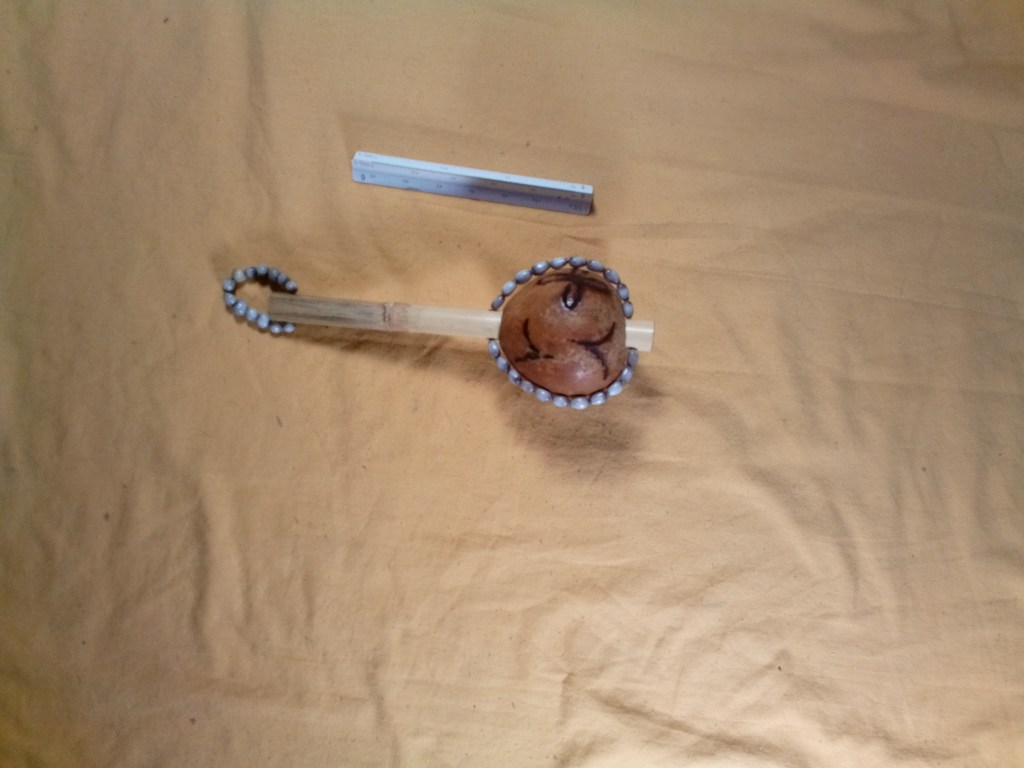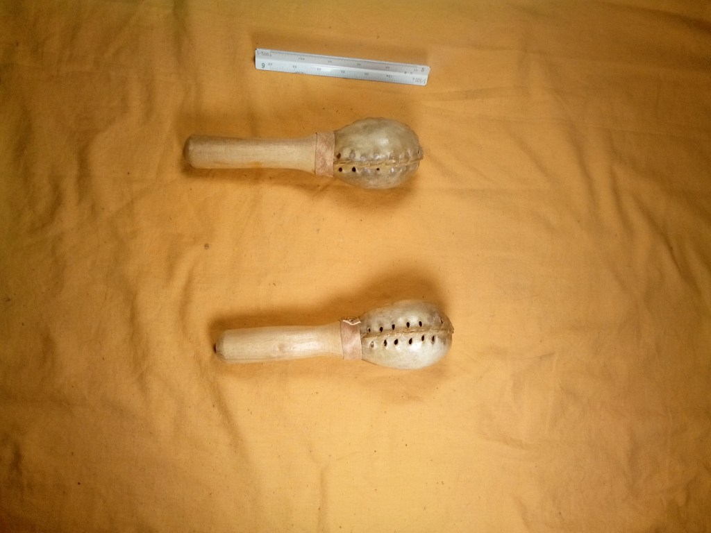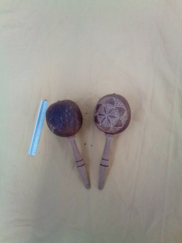 Maracas «chiquitanas», una calabaza entera, no hay necesidad de añadir mango, si se observa con cuidado hay un corte para añadir las semillas que se ha pegado con mucha delicadeza para que no sea fácil de observar. Comprada en uno de los muchos pueblos fundados por jesuitas, no recuerdo cuál, son muchos los que he recorrido y recomiendo visitar.