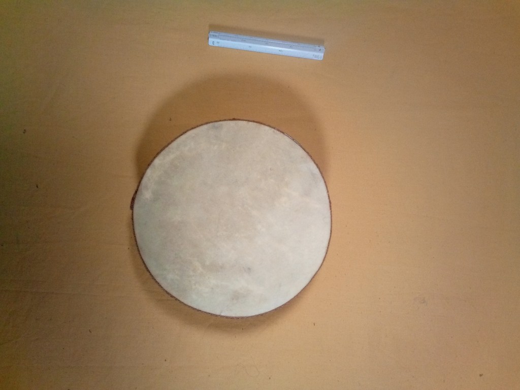 Tambor relleno de semillas, arena, no se, no he querido abrirlo. Puede tocarse agitando, golpeando con las manos, con baquetas…