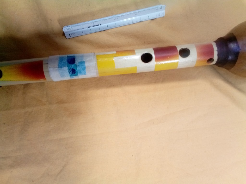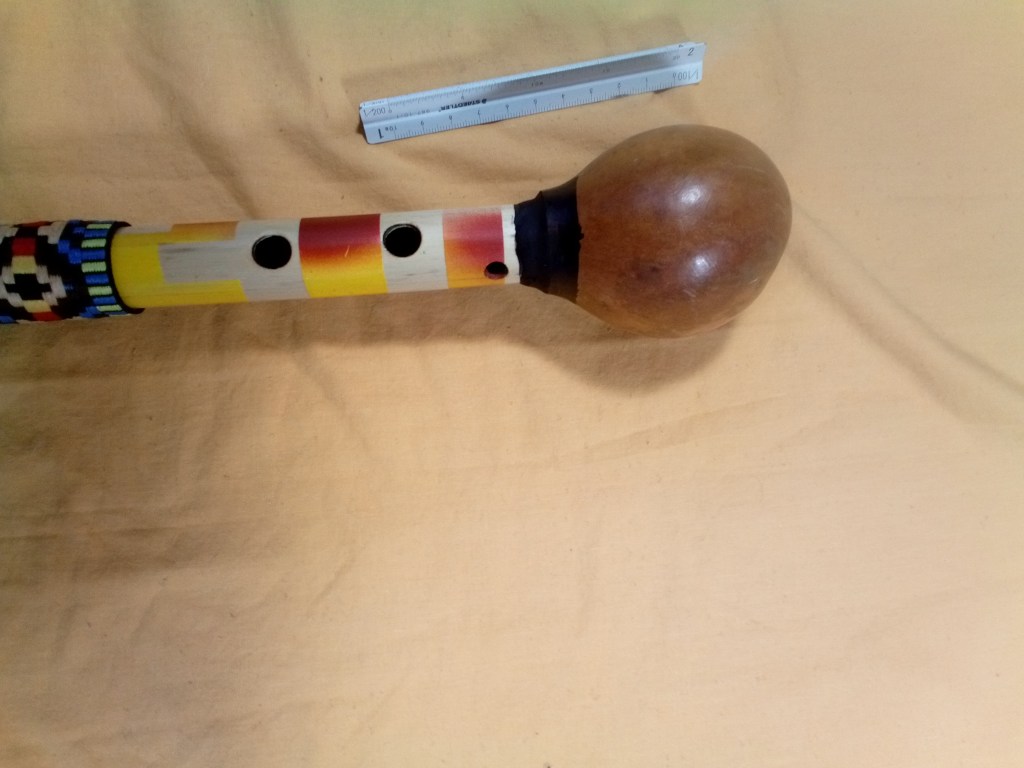 La primera embocadura produce solo dos sonidos, la otra es la del cuerpo largo. Se puede observar la maraca en el extremo. La pieza de lana protege la membrana.