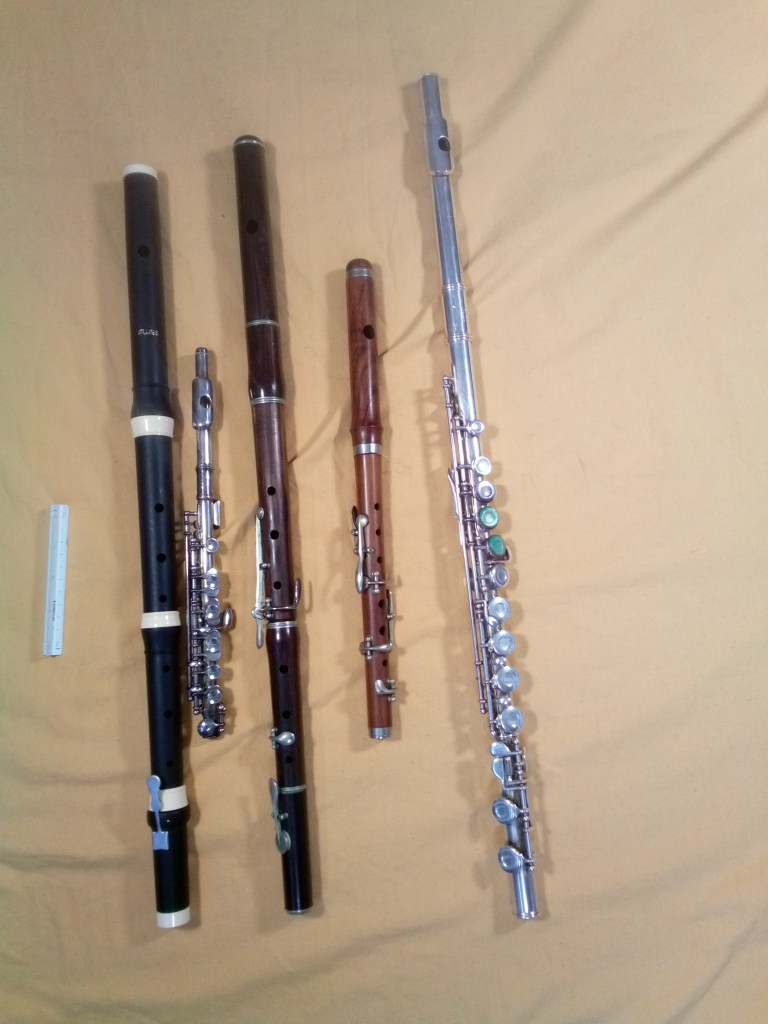 Traverso barroco es curioso, en el siglo XVIII la flauta era la de pico, la otra había que añadir un calificativo, en la actualidad es lo contrario. Tan sólo tiene una llave. Material sintético, comprada en Japón. Las actuales tienen el tubo cilíndrico y la cabeza con forma irregular, las primeras eran totalmente cilíndricas, las barrocas tenían forma cónica con la parte más ancha en la embocadura.