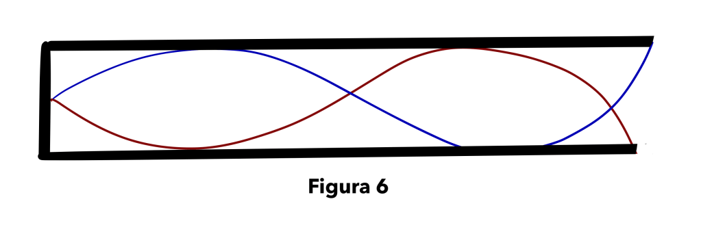 El primer armónico también es sorprendente. Dado que un extremo cerrado implica un nodo nos encontramos con la siguiente disposición; nodo, vientre, nodo y vientre, es decir un tercio de la longitud de onda del sonido fundamental, dicho de otra manera la decimosegunda (figura 6).