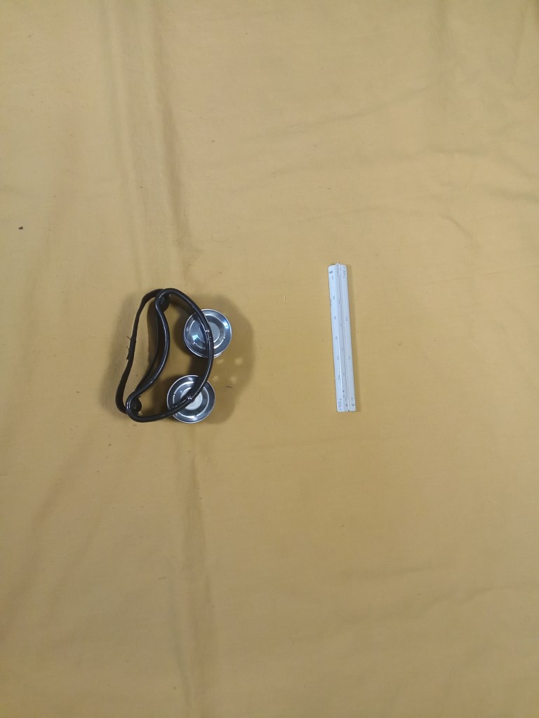 Accesorios para tocar este instrumento. Una piedra (esta es semipreciosa, a mi me gusta, no me convence para tocar, es un cristal y puede provocar cortes) tengo que buscar otra más adecuada, algún día me doy un paseo por el río y cojo algún canto rodado. También es posible con una arandela grande. Y un palo para golpear.