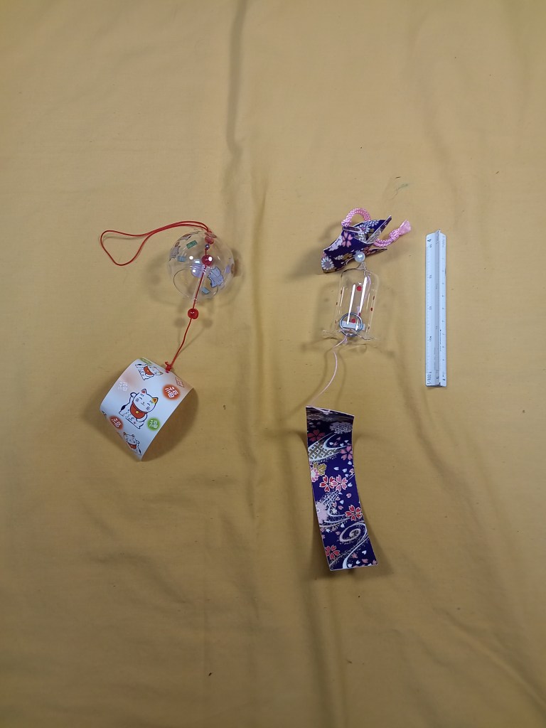 Campanillas de cristal compradas en Tokyo. Tienen la particularidad de que el badajo tiene una cuerda a la que se ata un papel, el viento mueve éste y la campanillas suena. Hay templos y jardines con cientos de estas campanillas, es interesante escucharlas. Ignoro si además de un efecto encantador tienen otros beneficios de tipo espiritual.