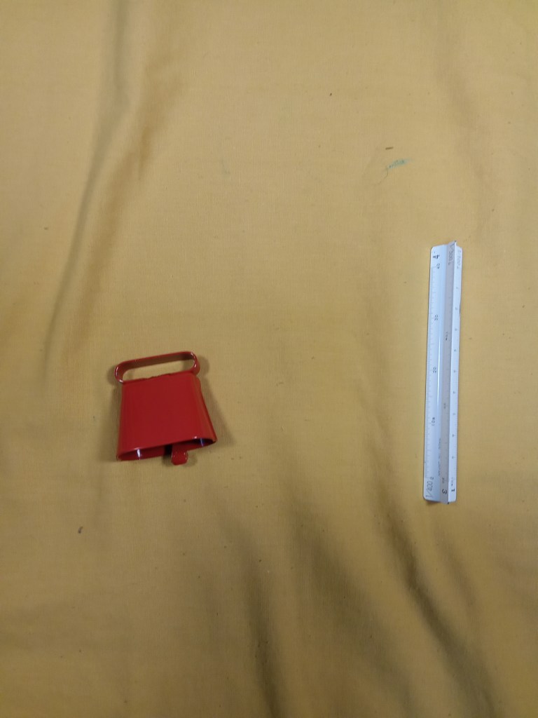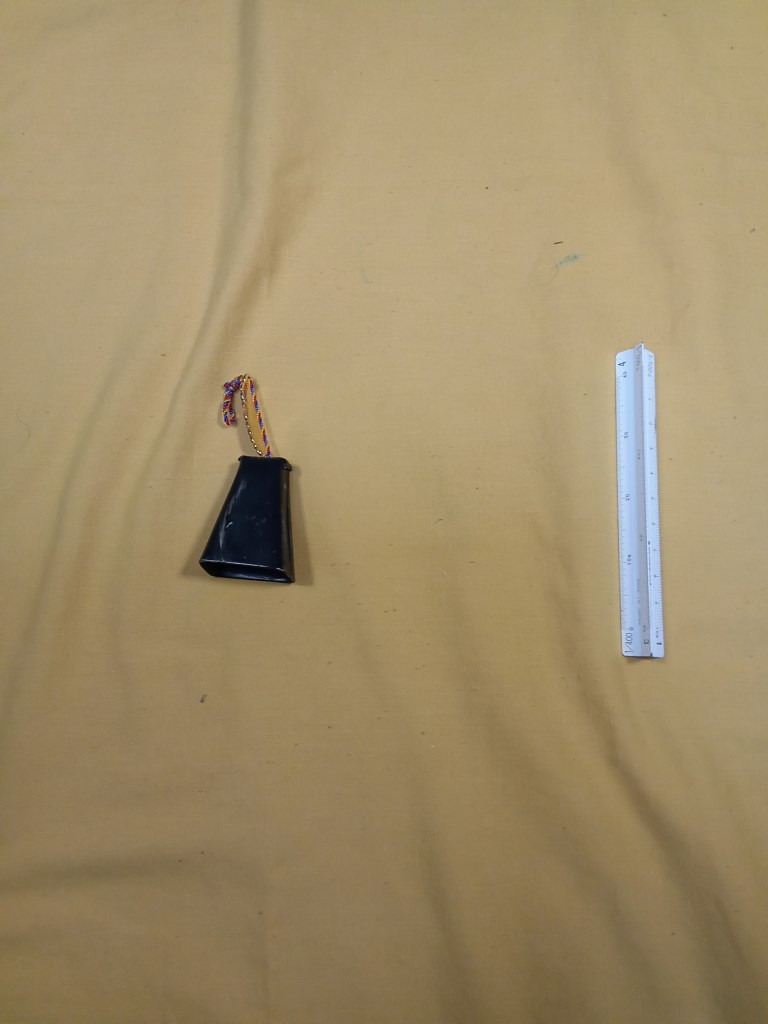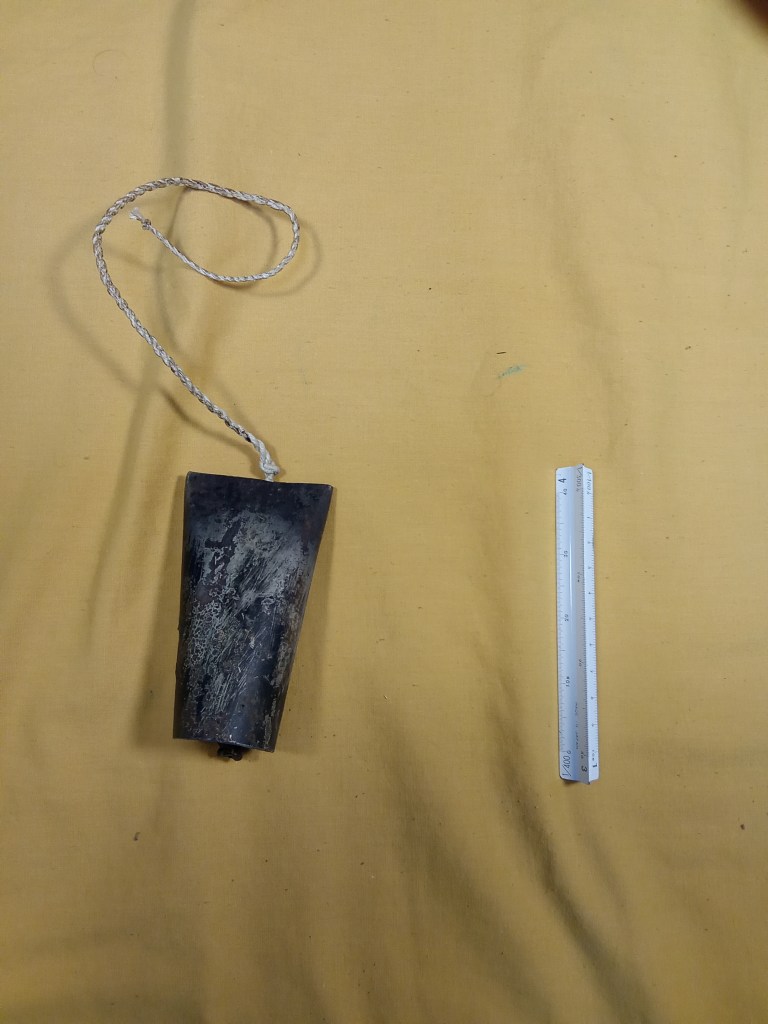 Cencerro en miniatura para uso musical. No tiene badajo, se toca con una baqueta. Comprado en Cali, Colombia.
