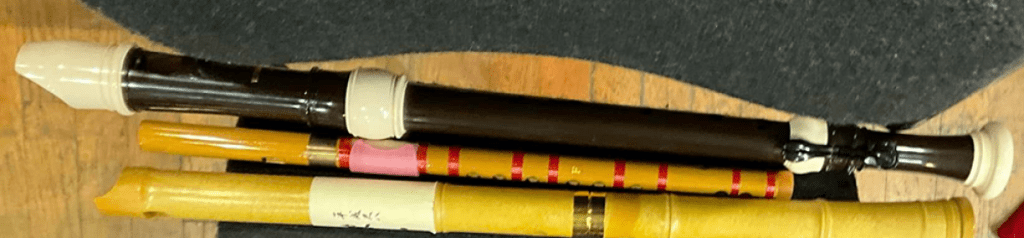 La foto recoge tres de las flautas que utilicé en el estreno de la obra «…Y mi monumento el mar», de mi amigo y colega Enrique Blanco.